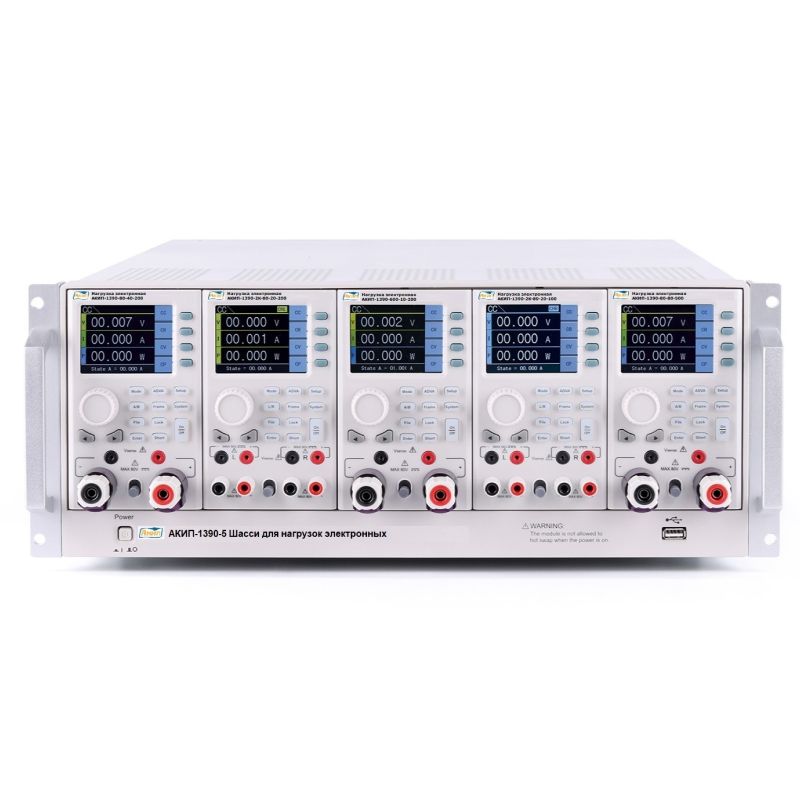 Электронная нагрузка выполнена в модульном форм-факторе и требует установки в шасси АКИП-1390-2 для двух модулей либо АКИП-1390-5 для пяти модулей. Такое решение позволяет оптимизировать рабочее пространство и собирать тестовую систему в соответствии с текущими задачами. Устройство поддерживает стандарт 19-дюймового форм-фактора, что облегчает его интеграцию в лабораторные стойки и измерительные комплексы.