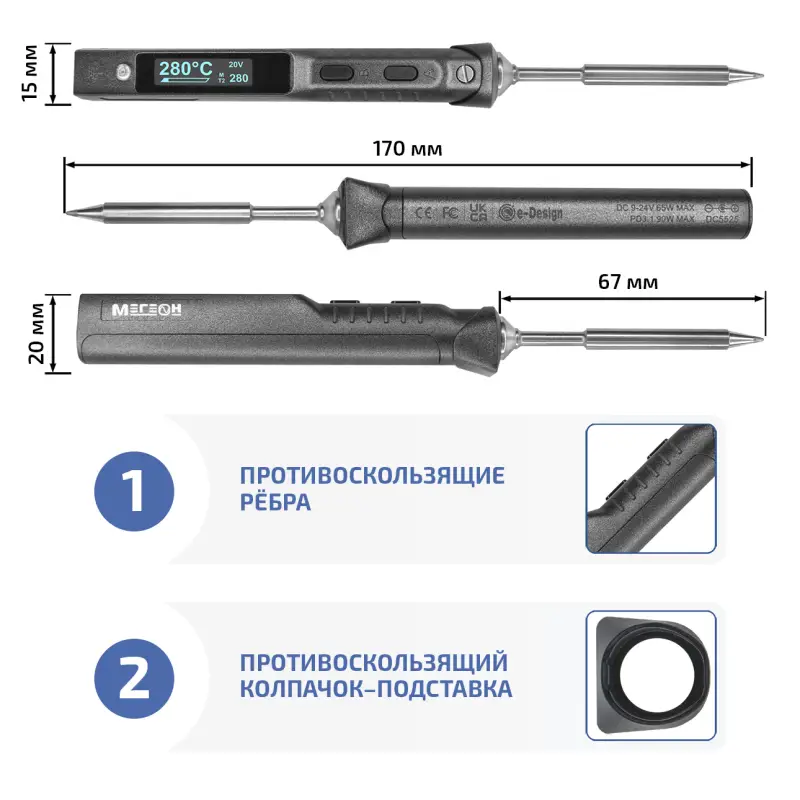 Портативный паяльник МЕГЕОН TS101 – это современный инструмент для профессионального и бытового использования, сочетающий в себе компактность, высокую мощность и удобство эксплуатации. Благодаря широкому диапазону регулировки температуры от 50 до 400 ˚С, он подходит для работы с различными типами припоя и компонентов, обеспечивая точность и надежность при пайке как мелких электронных деталей, так и более массивных соединений.